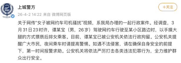 杭州上城警方4月2日通报:关于网传“女子被网约车司机骚扰”视频,系我局办理的一起行政案件。经调查,3月31日23时许,谭某宝(男,26岁)驾驶网约车行驶至某小区路边时,以手摸大腿的方式猥亵后排女乘客。目前,谭某宝已被公安机关依法行政拘留。公安机关提醒广大市民,夜间乘车时请提高警惕。如遇不法侵害,请在确保自身安全的前提下,第一时间报警求助。公安机关将依法严厉打击各类违法犯罪行为,全力维护群众出行安全。