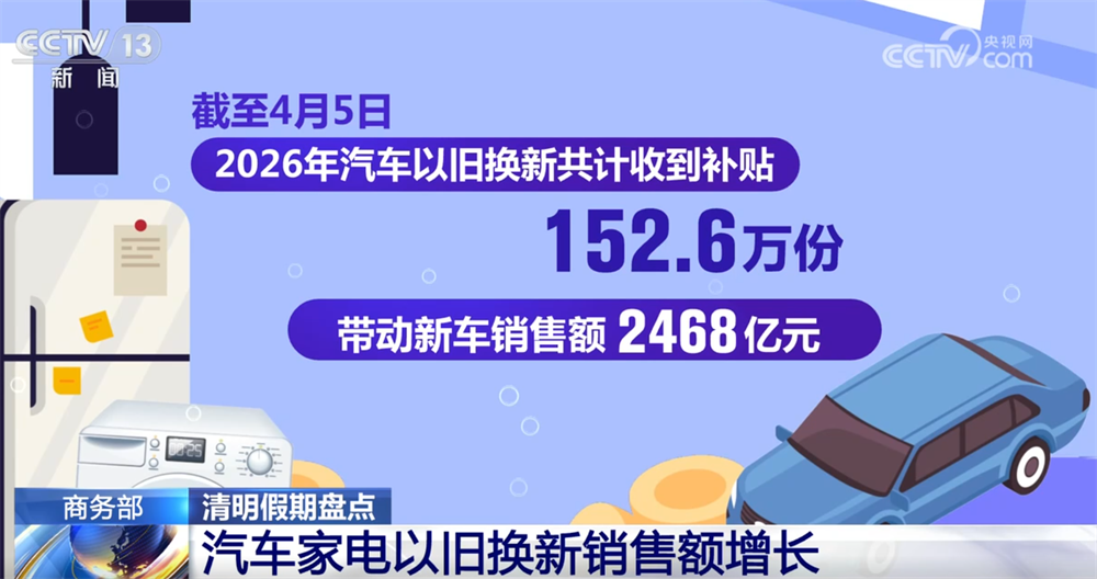 商品消费方面,截至4月5日,2026年汽车以旧换新共计收到补贴152.6万份,带动新车销售额2468亿元。家电以旧换新、数码和智能购新产品销售6284.5万台,带动销售额2159.7亿元。重点平台智能眼镜、智能手表手环销售额分别增长3.2倍、12.3%。