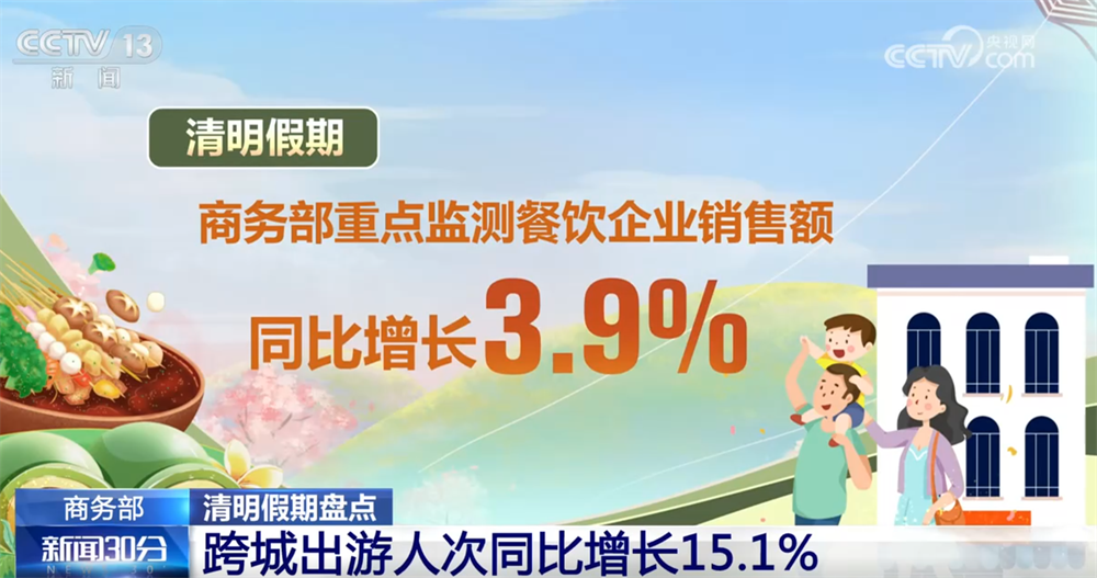 商务部商务大数据显示,清明假期,全国重点零售和餐饮企业日均销售额同比增长2.4%,商务部重点监测的78个步行街(商圈)客流量、营业额分别增长6.0%、6.7%。