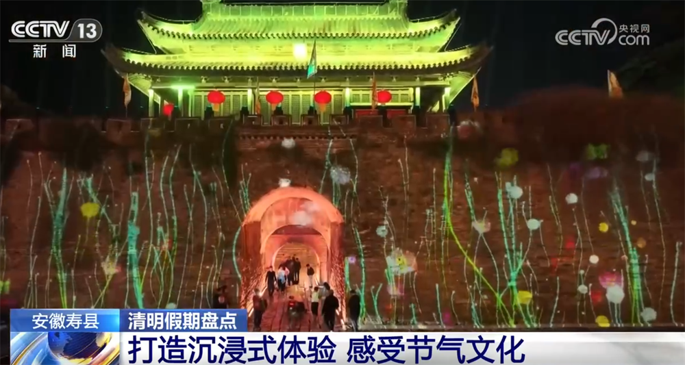 夜幕降临,寿县古城墙迎来了震撼的时刻。3D投影技术将二十四节气的灵动变迁一一投射在斑驳的城墙上,吸引了众多游客前来打卡拍照。据统计,这个清明假期,寿县古城累计接待游客11万人次。