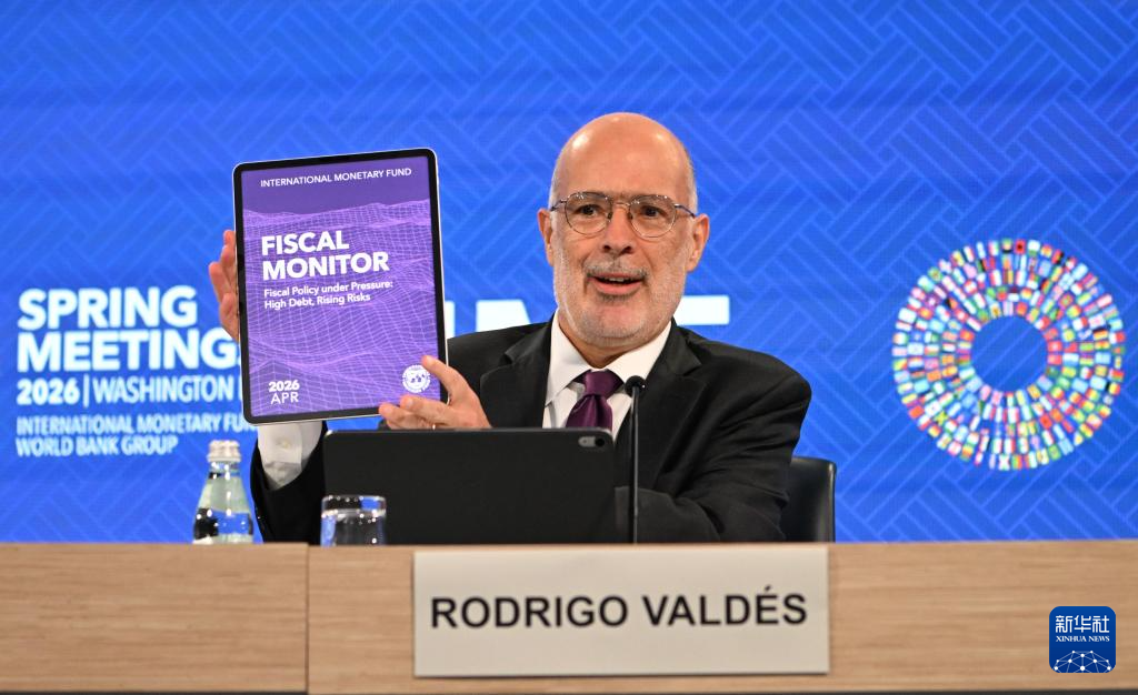 4月15日,在美国华盛顿,国际货币基金组织财政事务部主任罗德里戈·巴尔德斯在《财政监测报告》新闻发布会上展示报告。新华社记者 李睿 摄
