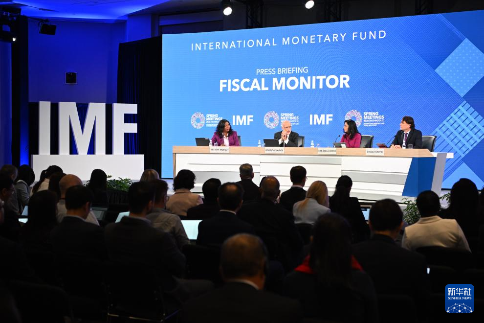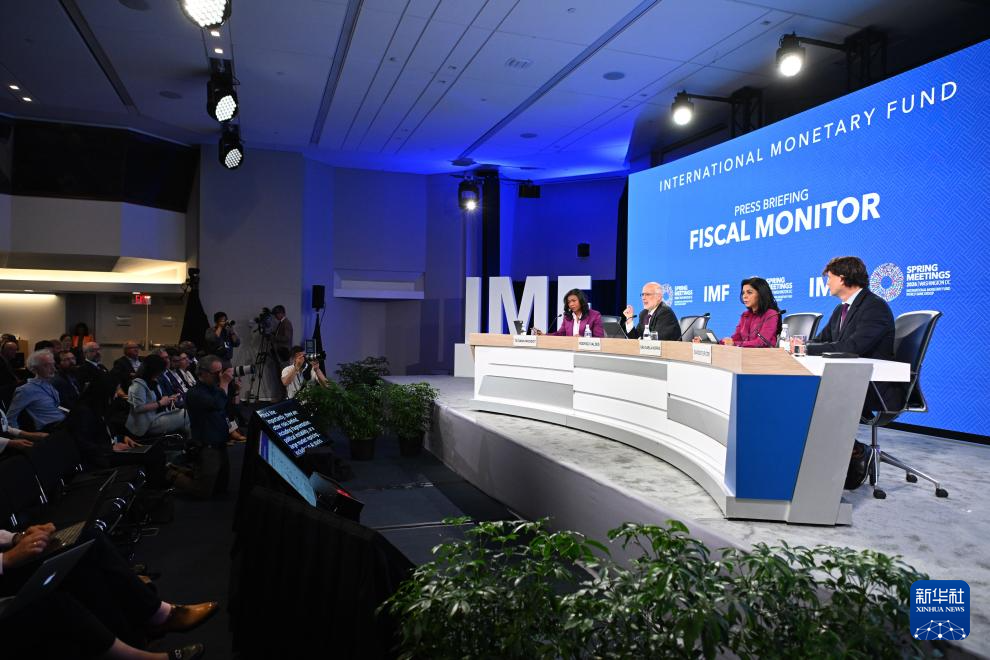 4月15日,在美国华盛顿,国际货币基金组织财政事务部主任罗德里戈·巴尔德斯(右三)在《财政监测报告》新闻发布会上讲话。新华社记者 李睿 摄