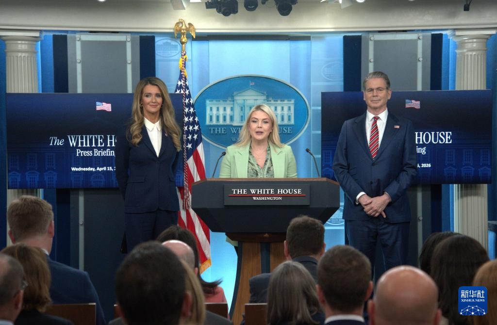 4月15日,在美国首都华盛顿白宫,白宫新闻秘书莱维特(中)出席记者会。新华社发(李源清摄)