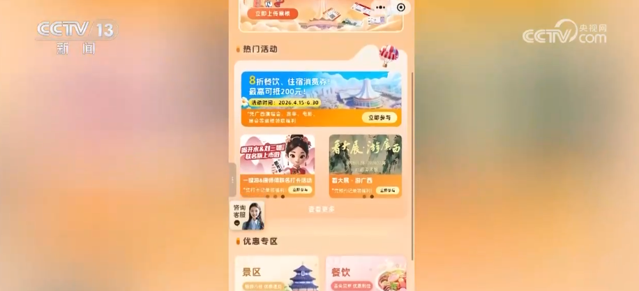 2026年,广西在“三月三”“五一”、端午等假期陆续发放总计超300万张“33消费券”,覆盖零售、餐饮、住宿、外卖等多元消费场景。同时,当地180多个景区还将推出200余项优惠措施,全面激活消费市场潜力。促消费活动将持续至6月底。