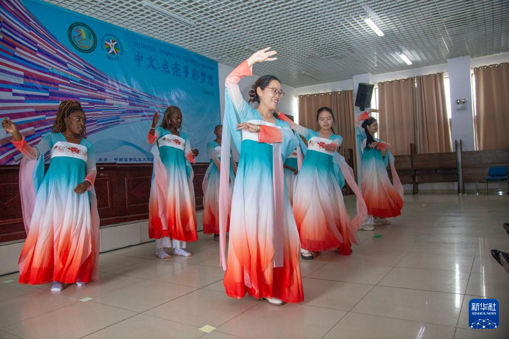 4月17日,人们在赞比亚卢萨卡的赞比亚大学孔院举行的庆祝活动上表演舞蹈。新华社发(马丁·姆班圭塔摄)
