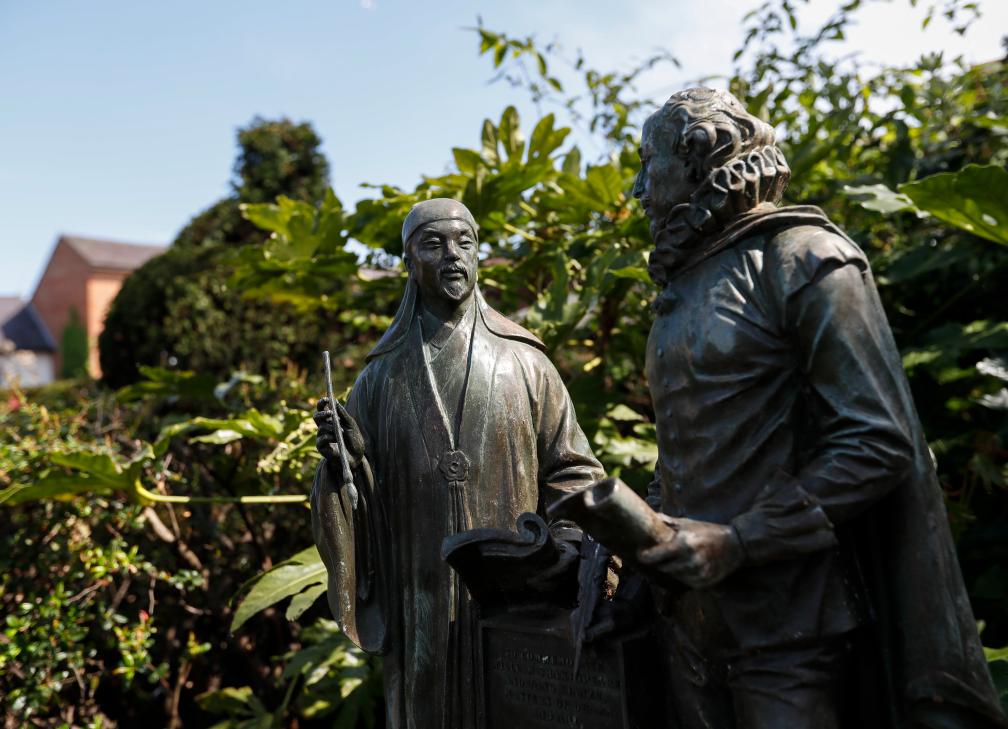 2022年4月20日在英国斯特拉特福拍摄的莎士比亚和汤显祖的青铜塑像。新华社记者 韩岩 摄