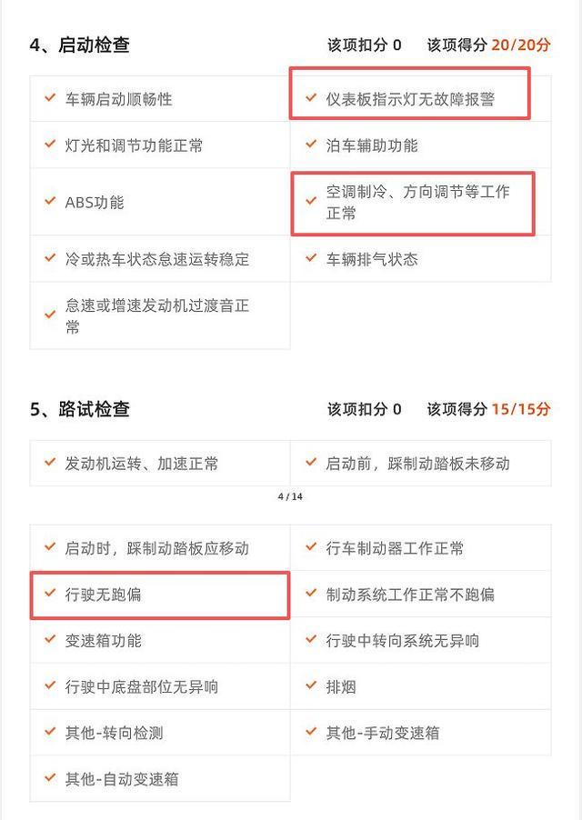 陈芳告诉记者,在签约阶段,优信二手车平台销售人员向她承诺是经过“315项检测”的“国标认证车”,并提供了详细的《车况综合说明书》。这份说明书中对车身结构、刹车、底盘、排除火烧车、排除泡水车等逐一标注“合格”,看上去专业而全面。在“启动检查”一栏中明确标注:“仪表板指示灯无故障报警”“空调制冷、方向调节等工作正常”,该项得分20/20分,扣分为0。在“路试检查”一栏中,同样得分15/15分,扣分为0。