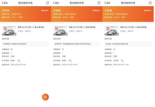 然而,与高分的《车况综合说明书》形成鲜明反差的,是陈芳夫妇频繁地报修记录:3月22日,报修“车辆养护-车辆健康检查/轮胎动平衡/四轮换位”;3月23日,报修“空调系统-空调制冷/制热异常”;4月9日,报修“发动机-仪表发动机故障灯亮”。