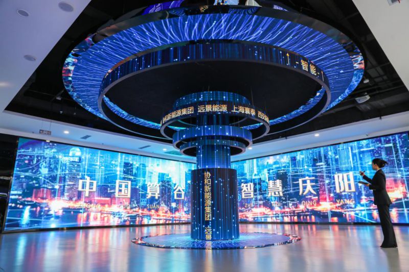 在全国一体化算力网络国家枢纽节点(甘肃)庆阳数据中心集群展示中心,工作人员介绍“东数西算”工程规划及建设推进情况。新华社记者郎兵兵摄